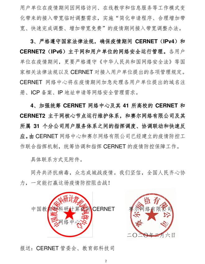 2、免費調(diào)整疫情期間CERNET用戶單位和CERNET(IPv4)和CERNET2(IPv6)主干網(wǎng)的接入帶寬需求;