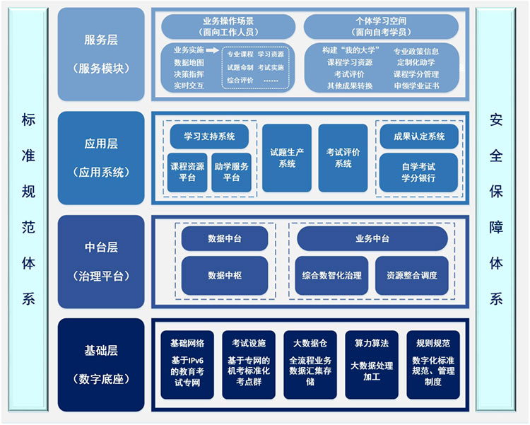 5)標(biāo)準(zhǔn)規(guī)范體系。根據(jù)自學(xué)考試領(lǐng)域業(yè)務(wù)特點,結(jié)合各級自學(xué)考試機構(gòu)、高等學(xué)校不同主體職責(zé)分工,強化統(tǒng)一標(biāo)準(zhǔn)體系建設(shè),建立健全自學(xué)考試數(shù)字化發(fā)展必備的數(shù)據(jù)標(biāo)準(zhǔn)、資源標(biāo)準(zhǔn)、業(yè)務(wù)規(guī)范、應(yīng)用規(guī)范、安全規(guī)范等。