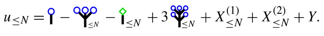 隨后,上述三位作者與合作者普林斯頓大學(xué) B. Bringmann解決了前述第二個(gè)難題,即三維三階非線性波方程的吉布斯測度的不變性問題,成果發(fā)表在今年4月29日出版的《數(shù)學(xué)新進(jìn)展》上。前述概率臨界猜想為解決該難題提供了深刻的洞見。在這篇長達(dá) 279 頁的論文中,岳海天與合作者創(chuàng)造性地運(yùn)用了概率論、調(diào)和分析、數(shù)論、組合數(shù)學(xué)、偏微分方程等數(shù)學(xué)分支中的隨機(jī)量子化、擬控制理論、格點(diǎn)計(jì)數(shù)估計(jì)、隨機(jī)張量理論、分子圖分析等多種復(fù)雜技術(shù)工具從而證明了在吉布斯概率初值下三維三階波方程會按照既定結(jié)構(gòu)演化 (見圖2 )。
