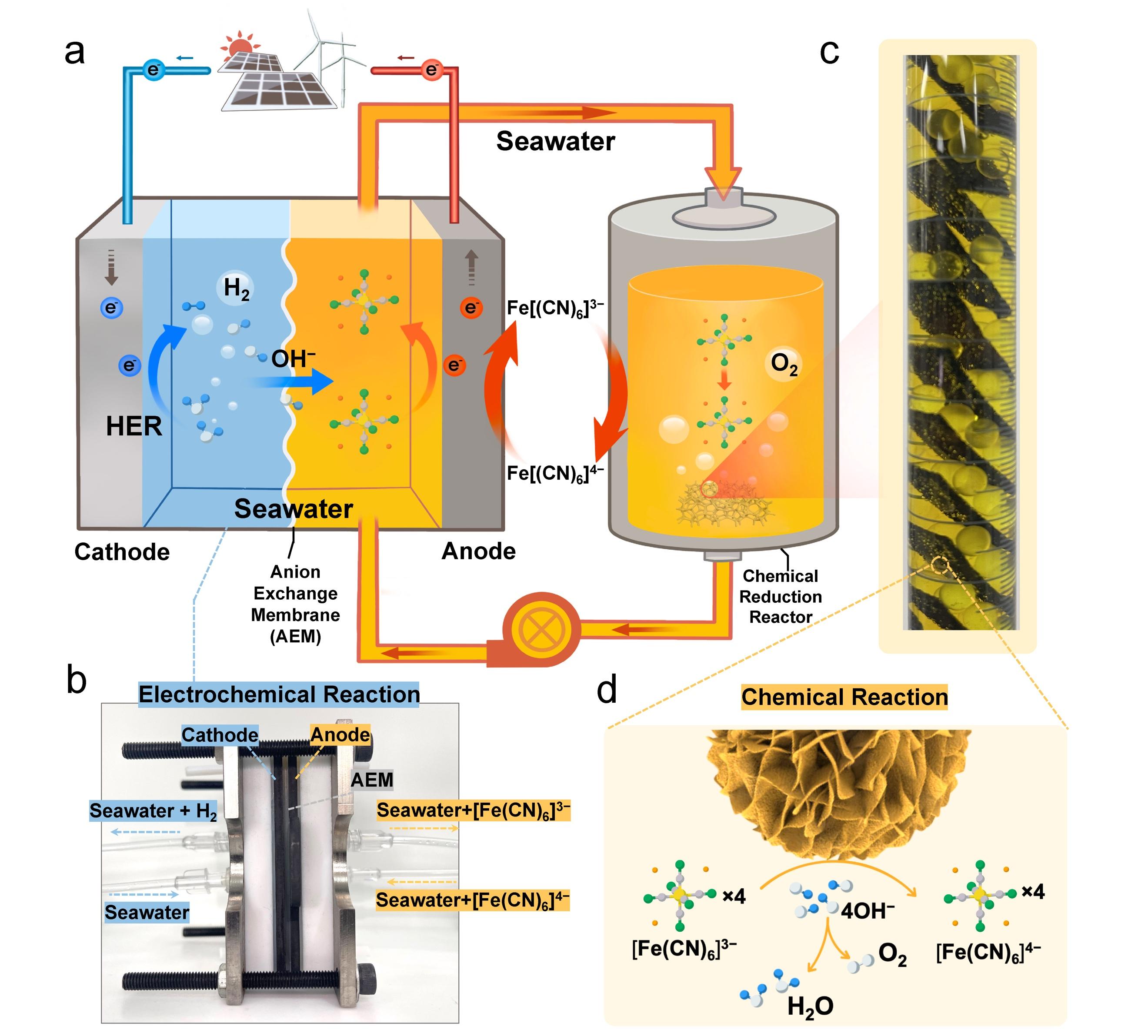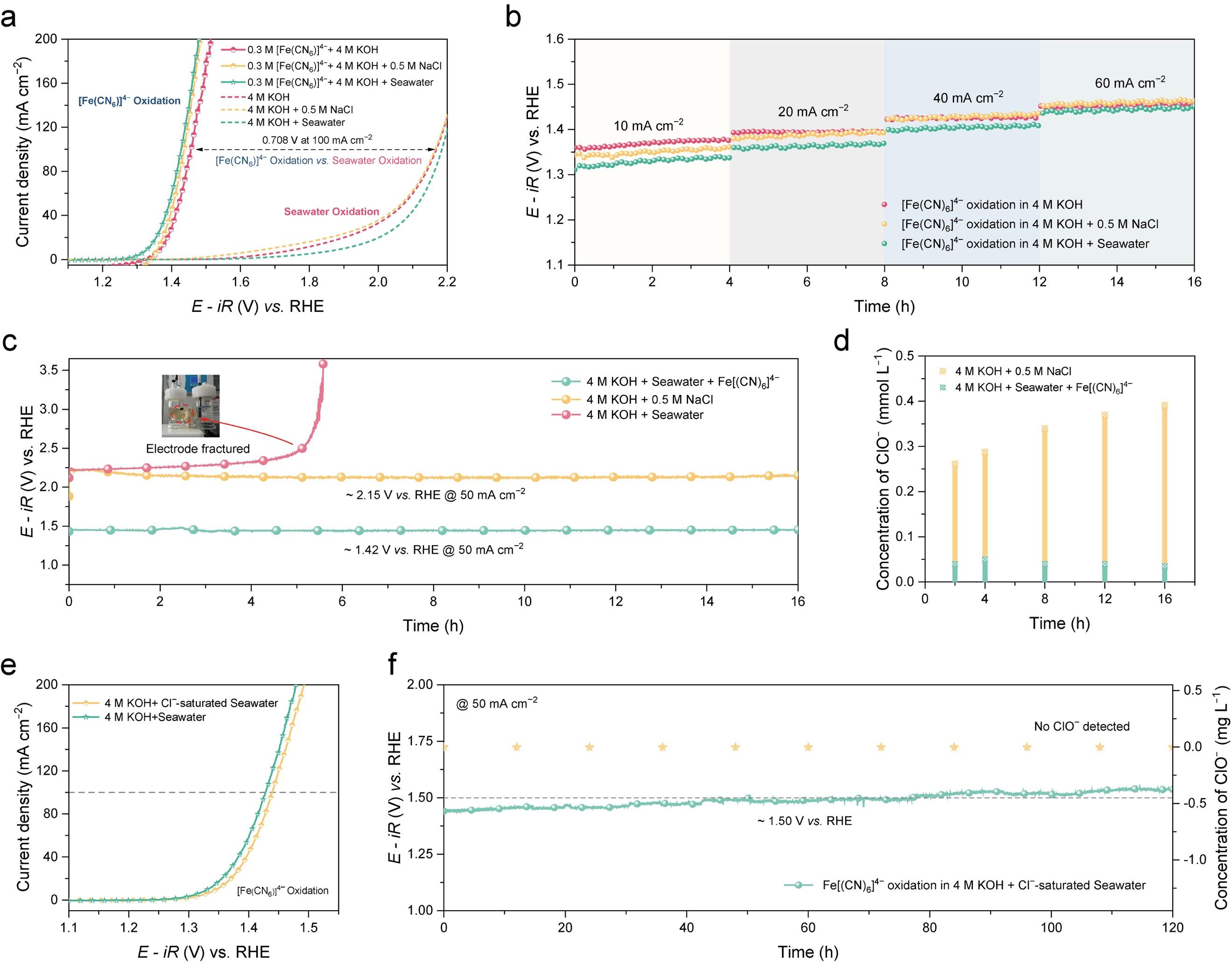 不同于2022年11月謝和平院士團(tuán)隊Nature正刊上提出的相變遷移海水直接電解制氫顛覆性原理技術(shù),該研究是謝和平院士團(tuán)隊圍繞海水中的氯離子引發(fā)副反應(yīng)和電極腐蝕現(xiàn)象,提出的另一種新的解耦式海水直接電解制氫策略。論文系統(tǒng)研究了鐵氰酸根/亞鐵氰酸根電對([Fe(CN)6]3?/4?)在真實海水體系下可逆氧化還原特性,探明了電解系統(tǒng)陰極析氫反應(yīng)與陽極亞鐵氰酸根氧化反應(yīng)的高效性,厘清了解耦體系下氧氣自發(fā)穩(wěn)定產(chǎn)出的反應(yīng)機(jī)理,實現(xiàn)了全新系統(tǒng)在真實海水環(huán)境下250小時的長時間穩(wěn)定。該項原理技術(shù)巧妙規(guī)避了海水中氯離子對電解制氫反應(yīng)的干擾,充分驗證了解耦式海水直接電解制氫系統(tǒng)在復(fù)雜海水環(huán)境下的抗腐蝕性與對氯離子副反應(yīng)的應(yīng)用潛力,將有助于豐富和進(jìn)一步構(gòu)建破解海水復(fù)雜成分影響的海水電解制氫理論體系和技術(shù)框架。