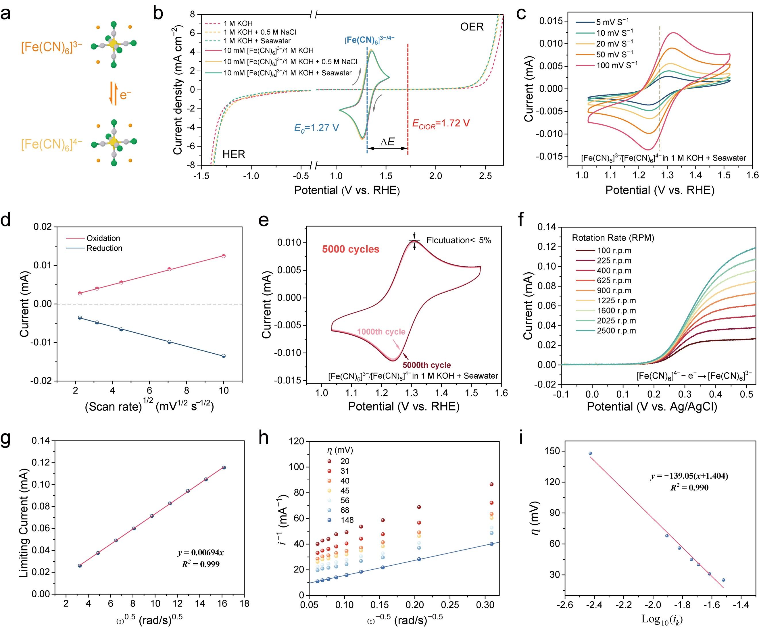 該研究針對海水制氫中最棘手的氯離子干擾難題,引入氧化還原介導(dǎo)的解耦策略,利用兼具熱力學(xué)和動力學(xué)優(yōu)勢的陽極反應(yīng),巧妙規(guī)避了傳統(tǒng)電解水制氫過程中析氧反應(yīng)與氯離子反應(yīng)的直接競爭,大幅降低了電化學(xué)腐蝕。在該研究中,[Fe(CN)6]3?/4?電對在在海水中不僅保持了優(yōu)異的可逆氧化還原動力學(xué)特性,而且在200 mA cm?2的接近工業(yè)級電流密度下實現(xiàn)了超過250小時的長時間穩(wěn)定運行。