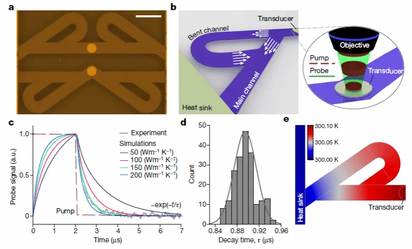 特斯拉閥門在微流體系統(tǒng)中對流體流動的整流作用顯著,它啟發(fā)了研究者們參照液態(tài)環(huán)境中的流體整流機制,設計出現(xiàn)代固態(tài)電子和熱整流器件。與微流體通道中的流體整流不同,微固體通道中的熱聲子整流更為復雜,原因在于聲子之間缺乏動量守恒的碰撞,同時類似液態(tài)的聲子流動發(fā)生的頻率不高。該工作通過聲子流體動力學的方法,在同位素富集的石墨晶體中實現(xiàn)了熱傳導的整流。研究人員在90納米厚的石墨中設計了一個微米級的特斯拉閥門,實驗觀察到在45K時,熱導率在相反方向上有15.2%的明顯差異。這項研究是利用集體聲子行為進行微電子設備熱管理的重要進展,為固態(tài)材料中的熱整流技術的發(fā)展奠定了基礎。
