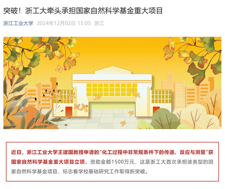 浙江工業(yè)大學(xué)王建國(guó)教授申請(qǐng)的“化工過(guò)程中非常規(guī)條件下的傳遞、反應(yīng)與測(cè)量”獲國(guó)家自然科學(xué)基金重大項(xiàng)目立項(xiàng),資助金額1500萬(wàn)元,這是浙工大首次承擔(dān)該類(lèi)型的國(guó)家自然科學(xué)基金項(xiàng)目,標(biāo)志著學(xué)校基礎(chǔ)研究工作取得新突破……>>查看詳情