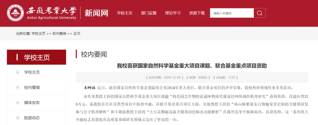 宋傳奎教授主持的國(guó)家自然科學(xué)基金重大項(xiàng)目課題“特色園藝作物特征滋味物質(zhì)代謝途徑網(wǎng)絡(luò)調(diào)控機(jī)理研究”獲得資助,直接經(jīng)費(fèi)320萬(wàn)元,系安徽農(nóng)業(yè)大學(xué)首次在該類(lèi)型項(xiàng)目中取得突破。在聯(lián)合基金重點(diǎn)項(xiàng)目方面,吳俊教授主持的“碭山酥梨果實(shí)石細(xì)胞發(fā)育啟始的關(guān)鍵基因發(fā)掘與分子機(jī)理解析”和王曉波教授主持的“大豆花期耐高溫關(guān)鍵基因挖掘及功能解析”在激烈競(jìng)爭(zhēng)中脫穎而出,喜獲資助。這一系列重大突破標(biāo)志著學(xué)校在高質(zhì)量基礎(chǔ)研究領(lǐng)域又邁出了堅(jiān)實(shí)的一步……>>查看詳情