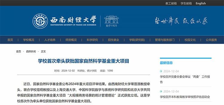 由西南財(cái)經(jīng)大學(xué)常晉源教授牽頭,聯(lián)合學(xué)??芫V教授以及上海交通大學(xué)、中國(guó)科學(xué)院數(shù)學(xué)與系統(tǒng)科學(xué)研究院和北京大學(xué)共同申報(bào)的國(guó)家自然科學(xué)基金重大項(xiàng)目“大規(guī)模商務(wù)場(chǎng)景的統(tǒng)計(jì)管理理論”正式獲批立項(xiàng)。這是西南財(cái)經(jīng)大學(xué)首次作為牽頭單位獲批國(guó)家自然科學(xué)基金重大項(xiàng)目……>>查看詳情
