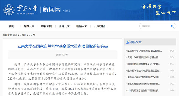 云南大學(xué)牽頭聯(lián)合中國(guó)科學(xué)院植物研究所、中國(guó)農(nóng)業(yè)科學(xué)院農(nóng)業(yè)基因組研究所、山西農(nóng)業(yè)大學(xué)、四川農(nóng)業(yè)大學(xué)申報(bào)的國(guó)家自然科學(xué)基金重大項(xiàng)目“糧食作物多年生特性的基礎(chǔ)研究”正式獲批立項(xiàng)。這是云南大學(xué)基礎(chǔ)研究項(xiàng)目自2022年以來(lái)第二次獲國(guó)家自然科學(xué)基金重大項(xiàng)目立項(xiàng)支持?!?a href="http://www.yhtest.cn/news/dongtai/202412/t20241209_2645417.shtml">>>查看詳情