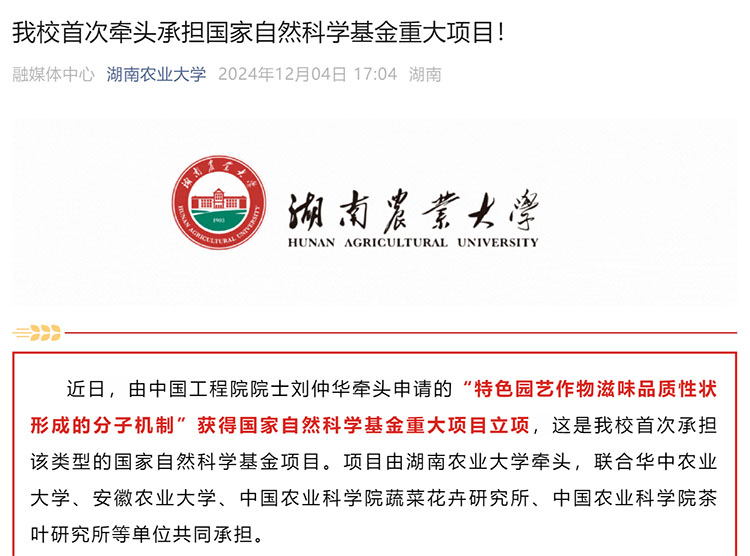 由中國(guó)工程院院士劉仲華牽頭申請(qǐng)的“特色園藝作物滋味品質(zhì)性狀形成的分子機(jī)制”獲得國(guó)家自然科學(xué)基金重大項(xiàng)目立項(xiàng),這是湖南農(nóng)業(yè)大學(xué)首次承擔(dān)該類(lèi)型的國(guó)家自然科學(xué)基金項(xiàng)目。項(xiàng)目由湖南農(nóng)業(yè)大學(xué)牽頭,聯(lián)合華中農(nóng)業(yè)大學(xué)、安徽農(nóng)業(yè)大學(xué)、中國(guó)農(nóng)業(yè)科學(xué)院蔬菜花卉研究所、中國(guó)農(nóng)業(yè)科學(xué)院茶葉研究所等單位共同承擔(dān)……>>查看詳情