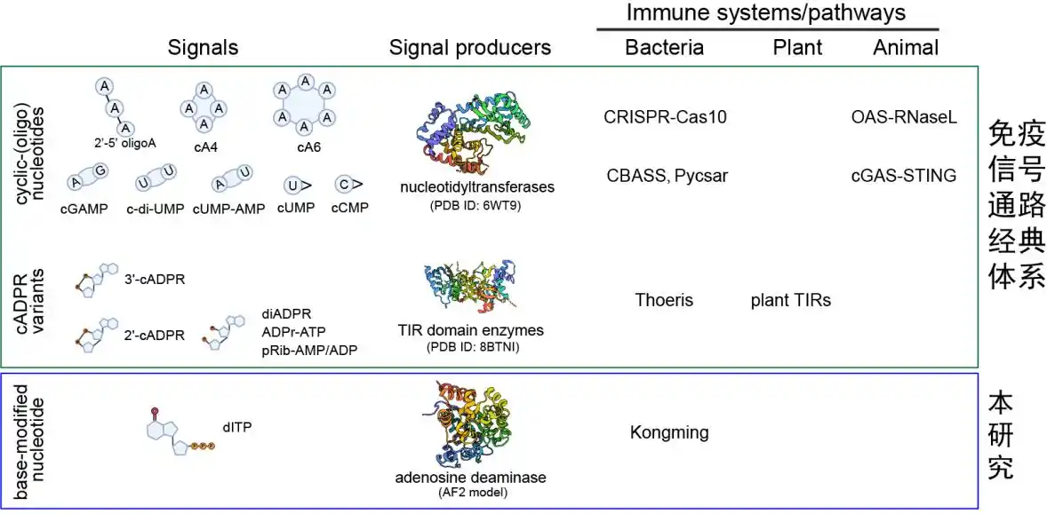 在微觀世界里,細(xì)菌與病毒之間每天都在上演著攻防大戰(zhàn)。生物體內(nèi)的信號傳遞如同精密的通信網(wǎng)絡(luò),而核苷酸分子長期被認(rèn)為是關(guān)鍵的“信號兵”。自1950年代發(fā)現(xiàn)環(huán)狀核苷酸(如cAMP、cGMP)以來,科學(xué)家已解析了其在代謝調(diào)節(jié)、免疫應(yīng)答中的核心作用,相關(guān)研究多次獲得諾貝爾獎。不同于環(huán)狀核苷酸的免疫作用,非典型核苷酸在過去普通被認(rèn)為不發(fā)揮任何生理作用。然而,研究團(tuán)隊(duì)通過基因分析,鎖定了一個由KomA(孔明A)、KomB(孔明B)、KomC(孔明C)三個蛋白組成的防御系統(tǒng)。當(dāng)噬菌體入侵時,其攜帶的脫氧核苷酸激酶(DNK)意外成為激活細(xì)菌免疫的“開關(guān)”:KomA與DNK協(xié)作,將核苷酸(dAMP)轉(zhuǎn)化為特殊信號分子dITP。這種分子能觸發(fā)KomC蛋白分解細(xì)胞內(nèi)的關(guān)鍵物質(zhì)NAD?,導(dǎo)致噬菌體因“能源枯竭”無法復(fù)制。令人稱奇的是,該系統(tǒng)巧妙利用入侵者攜帶的酶完成防御,正如三國時期諸葛亮“草船借箭”的智謀,因此被命名為“孔明系統(tǒng)”。這種堿基修飾核苷酸的信號傳導(dǎo)模式突破了環(huán)狀核苷酸作為信號分子的經(jīng)典理論體系,首次證實(shí)非典型核苷酸同樣具有免疫調(diào)控功能。