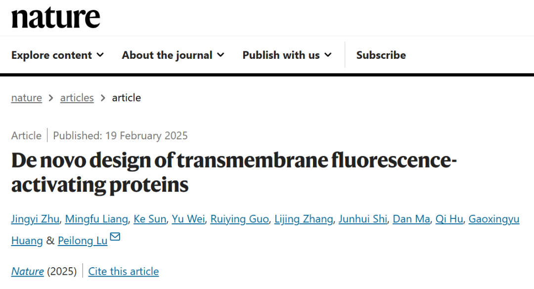 北京時間2025年2月20日,西湖大學(xué)未來產(chǎn)業(yè)研究中心、生命科學(xué)學(xué)院、西湖實驗室盧培龍課題組,在Nature雜志在線發(fā)表題為De novo design of transmembrane fluorescence-activating proteins的科研報道——他們首次實現(xiàn)了跨膜熒光激活蛋白的從頭設(shè)計,這也是第一個通過人工設(shè)計得到的能夠非共價結(jié)合特定小分子的跨膜蛋白。博士生朱璟熠、梁明福、孫科為本文共同第一作者,研究員盧培龍為通訊作者。
