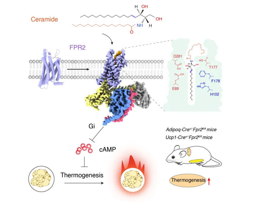 該研究首次發(fā)現(xiàn)了脂肪細胞中的神經(jīng)酰胺膜受體FPR2,系統(tǒng)闡明了神經(jīng)酰胺-FPR2信號軸調(diào)控脂肪產(chǎn)熱的作用機制,揭示了FPR2特異性識別神經(jīng)酰胺的分子機制。這項突破性工作不僅為深入理解神經(jīng)酰胺的生物學功能提供了全新視角,更為代謝性疾病的靶向治療開辟了新的研究方向。