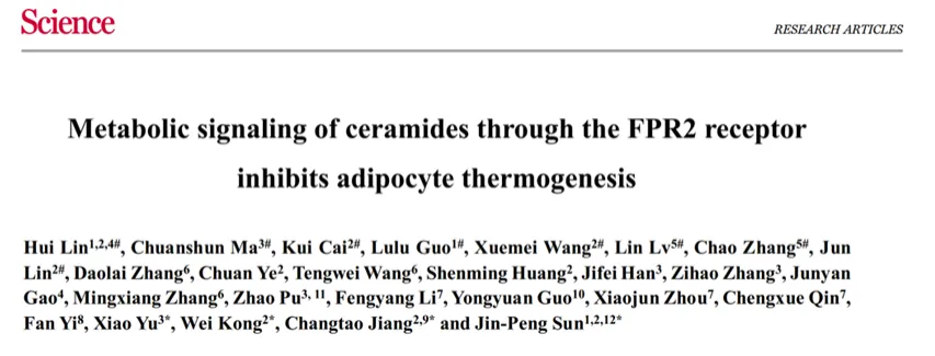 3月14日,山東大學基礎(chǔ)醫(yī)學院孫金鵬教授團隊,聯(lián)合北京大學醫(yī)學部基礎(chǔ)醫(yī)學院姜長濤教授和孔煒教授團隊、山東大學于曉教授團隊,在《科學》(Science)在線發(fā)表研究論文“Metabolic signaling of ceramides through the FPR2 receptor inhibits adipocyte thermogenesis”。