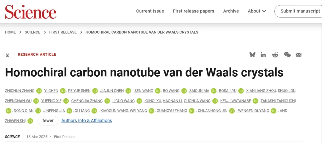 近日,上海交通大學(xué)物理與天文學(xué)院史志文教授、梁齊教授與合作者在《Science》上發(fā)表題為“Homochiral carbon nanotube van der Waals crystals”的研究論文,論文以First Release的形式在Science網(wǎng)站提前在線發(fā)表。該研究開發(fā)了一種制備碳納米管陣列的全新方法,成功實現(xiàn)了單一手性平行密排碳納米管陣列的直接生長,首次得到了碳納米管范德華晶體結(jié)構(gòu),并演示了所制備的碳納米管陣列可用于制造高性能場效應(yīng)晶體管器件。