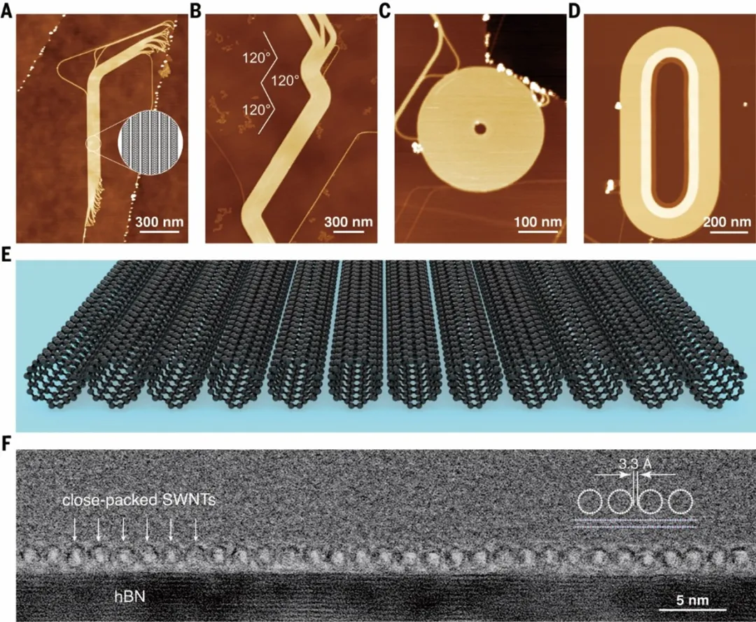 碳納米管陣列晶體是通過一種納米顆粒催化的化學(xué)氣相沉積(CVD)生長技術(shù)實現(xiàn)的。實驗觀測發(fā)現(xiàn),生長得到的碳納米管陣列均由同一手性的碳納米管組成,碳納米管之間相互平行、緊密排列,間距為固定的0.33 nm。理論分析揭示,這種近乎完美的陣列結(jié)構(gòu)的形成源自于碳納米管與六方氮化硼基底之間的超潤滑摩擦特性及碳納米管間的范德華相互作用:生長出的碳納米管可以在基底上自由滑動,找到能量更低的構(gòu)型,反復(fù)折疊排列在一起,并最終自組裝形成范德華晶體結(jié)構(gòu)。