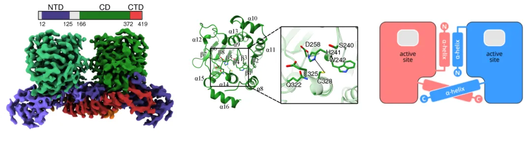 研究團隊成功表達并純化了具有活性的猴痘病毒核心蛋白酶,結(jié)合單顆粒冷凍電鏡和X射線晶體衍射技術,解析了其高分辨率的三維結(jié)構(gòu)(圖1)。核心蛋白酶呈現(xiàn)出二體的組裝模式,每個單體包括N端結(jié)構(gòu)域(N-terminal domain, NTD),催化結(jié)構(gòu)域(catalytic domain, CD)和C端結(jié)構(gòu)域(C-terminal domain, CTD)?;钚灾行奈挥诖呋Y(jié)構(gòu)域,包含一個催化三聯(lián)體Cys328-His241-Asp258。猴痘病毒核心蛋白酶的二體相互作用模式與其他重要人類病毒的蛋白酶不同,是核心蛋白酶結(jié)構(gòu)穩(wěn)定和發(fā)揮催化功能的關鍵。