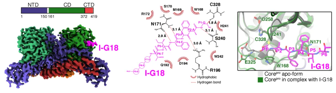 因此,為了開發(fā)更強效的新型靶向抑制劑,研究團隊開展了病毒核心蛋白酶底物識別和催化機制的研究。研究人員以核心蛋白酶一種天然底物P25K的序列為基礎,設計了一段C末端醛基取代的底物類似物I-G18。I-G18能夠與核心蛋白酶的催化中心的Cys328共價結(jié)合,模擬催化中間態(tài)的結(jié)構(gòu)特征。研究團隊通過冷凍電鏡技術,解析了這一復合物的三維結(jié)構(gòu)(圖2)。發(fā)現(xiàn)在底物的誘導下,核心蛋白酶活性中心發(fā)生一系列構(gòu)象變化,在S1和S2位形成特征的狹長口袋,僅可容納P1位Gly和P2位Ala這兩個側(cè)鏈極短的氨基酸,解釋了核心蛋白酶對底物中這兩個位置氨基酸的高度選擇性。