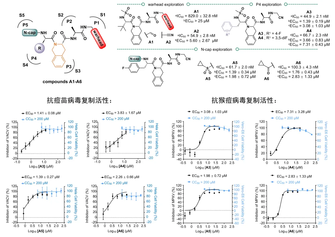 以核心蛋白酶的底物識別機制為基礎,研究團隊設計合成了一系列擬肽類抑制劑,其中A3-A6具有高效的病毒核心蛋白酶抑制活性(IC50范圍:44.9 nM~100.3 nM),且表現(xiàn)出較強的抗猴痘病毒活性(EC50范圍:1.98 μM~7.31 μM)和抗痘苗病毒活性(EC50范圍:1.39 μM~3.66 μM),同時具有良好的安全性(CC50大于200 μM)。研究人員解析了抑制劑A3與核心蛋白酶的復合物結(jié)構(gòu),他們發(fā)現(xiàn)A3不僅可以與蛋白酶的催化中心的Cys328形成共價鍵,還可以利用其化學修飾基團同底物結(jié)合口袋的氨基酸殘基形成額外的氫鍵相互作用,以增強其結(jié)合能力。這些研究結(jié)果表明了化合物A3-A6在后續(xù)開發(fā)廣譜抗痘病毒抑制劑上的具有巨大潛力,是良好的先導化合物。