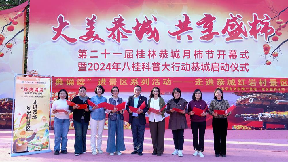 基地貫徹落實習(xí)近平總書記對“以文塑旅、以旅彰文,推動文化和旅游融合發(fā)展”的要求,打造“經(jīng)典誦讀進景區(qū)”活動品牌,宣傳桂林悠久的歷史文化和文旅產(chǎn)業(yè)發(fā)展新態(tài)勢。2024年,成功承辦了由教育部語言文字應(yīng)用管理司指導(dǎo)、中國教育電視臺等單位主辦的“典耀中華”主題讀書行動——全國校園節(jié)慶日誦讀融媒體直播廣西分會場活動?;顒佑?月21日在陽朔縣興坪古鎮(zhèn)碼頭直播,由學(xué)校師生、陽朔筏工及他們的家庭成員共同參與,活動反響強烈,有效宣傳了桂林市世界級旅游城市陽朔先導(dǎo)區(qū)的建設(shè)成效。