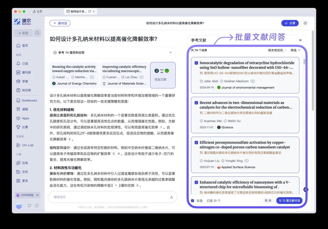 面對繁雜龐大的文獻(xiàn)資料,“科學(xué)導(dǎo)航”提供了批量文獻(xiàn)問答功能,大幅提升科研查閱效率。科研人員可以就某一課題提出綜合性的查詢,平臺(tái)將自動(dòng)從海量論文中提取整合相關(guān)內(nèi)容,一次性給出涵蓋多篇文獻(xiàn)精華的匯總答案。用戶也可以批量提交多個(gè)問題,AI將逐一檢索回答并匯聚結(jié)果進(jìn)行對比分析。這種批量化、一站式的文獻(xiàn)問答能力相當(dāng)于讓科研助手同時(shí)閱讀成百上千篇論文并提煉要點(diǎn),讓繁瑣的資料梳理變得高效,幫助北大師生在短時(shí)間內(nèi)掌握課題研究現(xiàn)狀和關(guān)鍵結(jié)論。