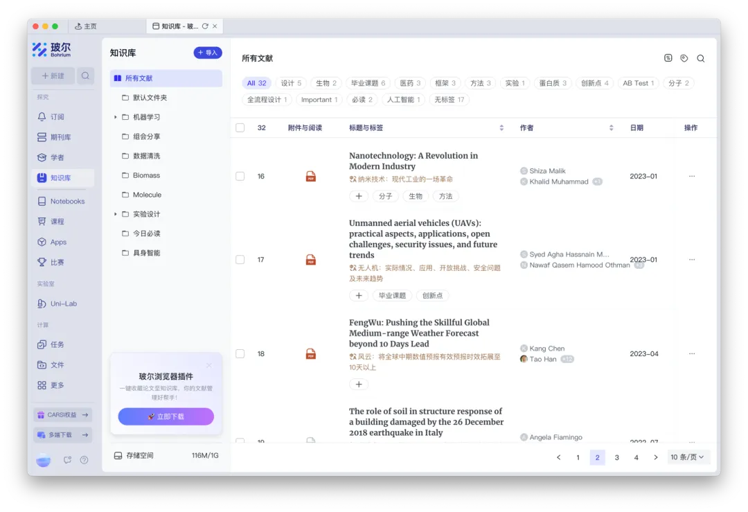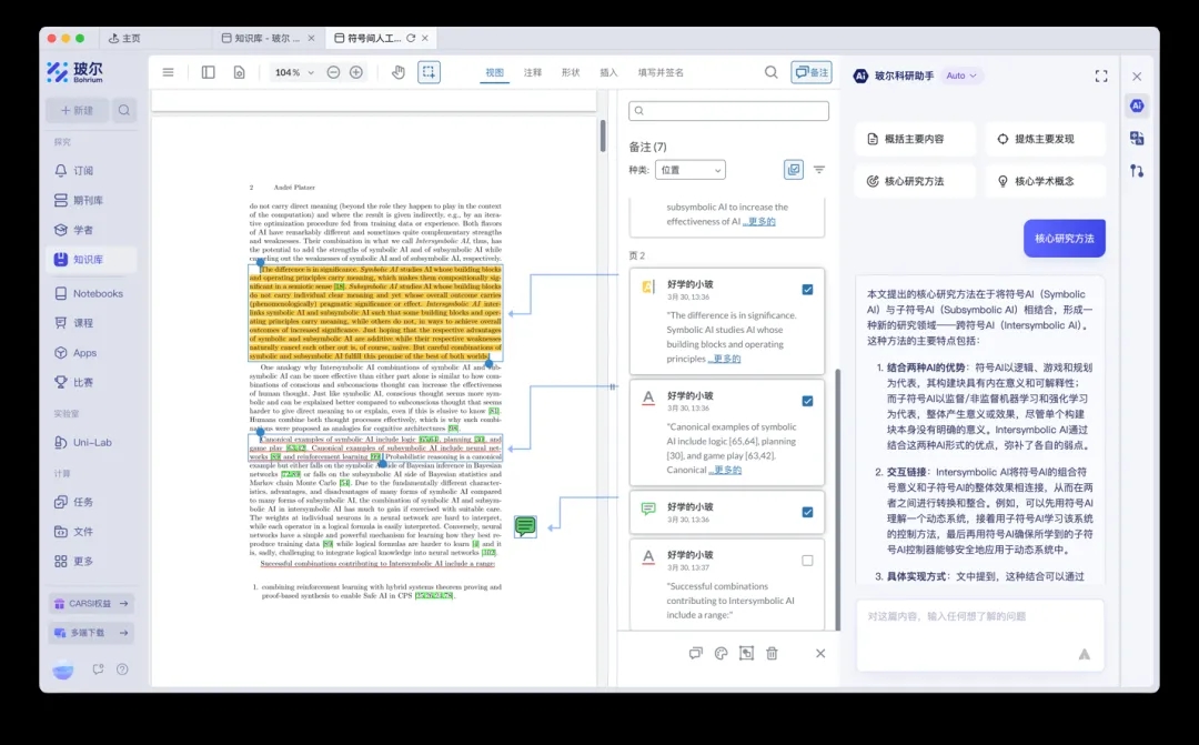 平臺(tái)提供多維度實(shí)時(shí)訂閱功能,支持按關(guān)鍵詞、期刊、學(xué)者、機(jī)構(gòu)等單一或組合維度定制追蹤方案,動(dòng)態(tài)聚合最新科研成果(如“人工智能+醫(yī)療”“基因編輯”等熱點(diǎn)領(lǐng)域的論文與學(xué)者動(dòng)態(tài))。智能知識(shí)庫則實(shí)現(xiàn)科研數(shù)據(jù)的全流程管理:支持論文、專利、筆記、AI對話等多模態(tài)數(shù)據(jù)統(tǒng)一存儲(chǔ),集成“智能科研閱讀器”輔助深度閱讀(含AI問答、智能翻譯、筆記標(biāo)注功能),采用分布式存儲(chǔ)架構(gòu)與元數(shù)據(jù)自動(dòng)標(biāo)注技術(shù),配合樹狀文件夾管理與自動(dòng)化標(biāo)簽系統(tǒng),可批量處理文獻(xiàn)問答,數(shù)據(jù)處理效率較傳統(tǒng)模式大幅提升。