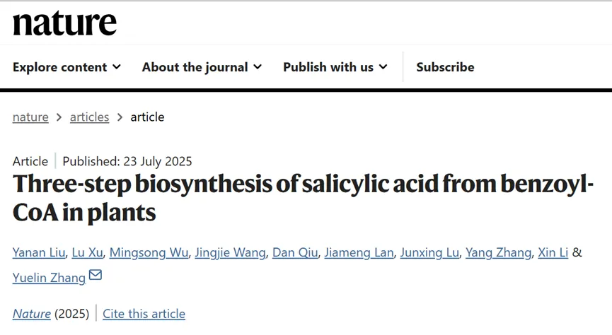 7月23日,四川大學(xué)生命科學(xué)學(xué)院張躍林教授團(tuán)隊(duì)在國際頂尖期刊Nature發(fā)表題為“Three-step biosynthesis of salicylic acid from benzoyl-CoA in plants”的突破性研究,首次完整解析植物中一條全新的水楊酸合成通路“PAL/BSH途徑”,并證明該通路在種子植物中廣泛存在且高度保守。四川大學(xué)生命科學(xué)學(xué)院劉亞楠副研究員和英屬哥倫比亞大學(xué)徐璐博士為論文共同第一作者,張躍林教授為通訊作者。四川大學(xué)張陽教授和英屬哥倫比亞大學(xué)李昕教授對該研究提出了重要建議和幫助。該研究得到了國家自然科學(xué)基金、四川省自然科學(xué)基金等項(xiàng)目資助。論文中涉及的水楊酸及其前體等化合物測試主要在四川大學(xué)生命科學(xué)學(xué)院質(zhì)譜平臺(tái)王晞華博士幫助下完成。