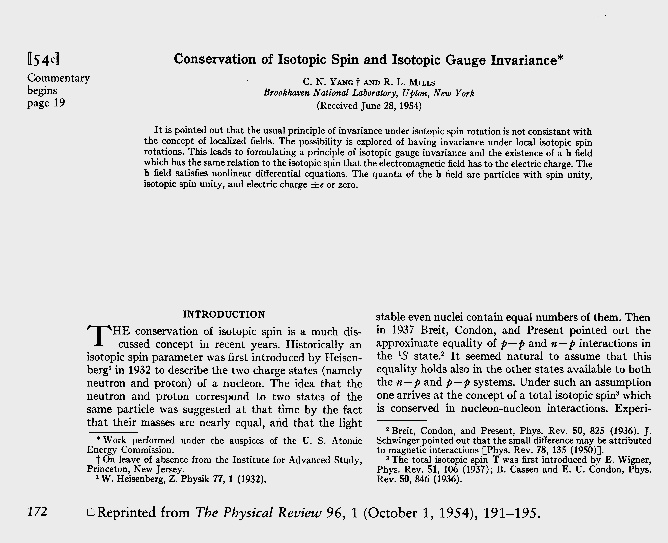 1954年楊振寧與米爾斯關于“非阿貝爾規(guī)范場”的論文