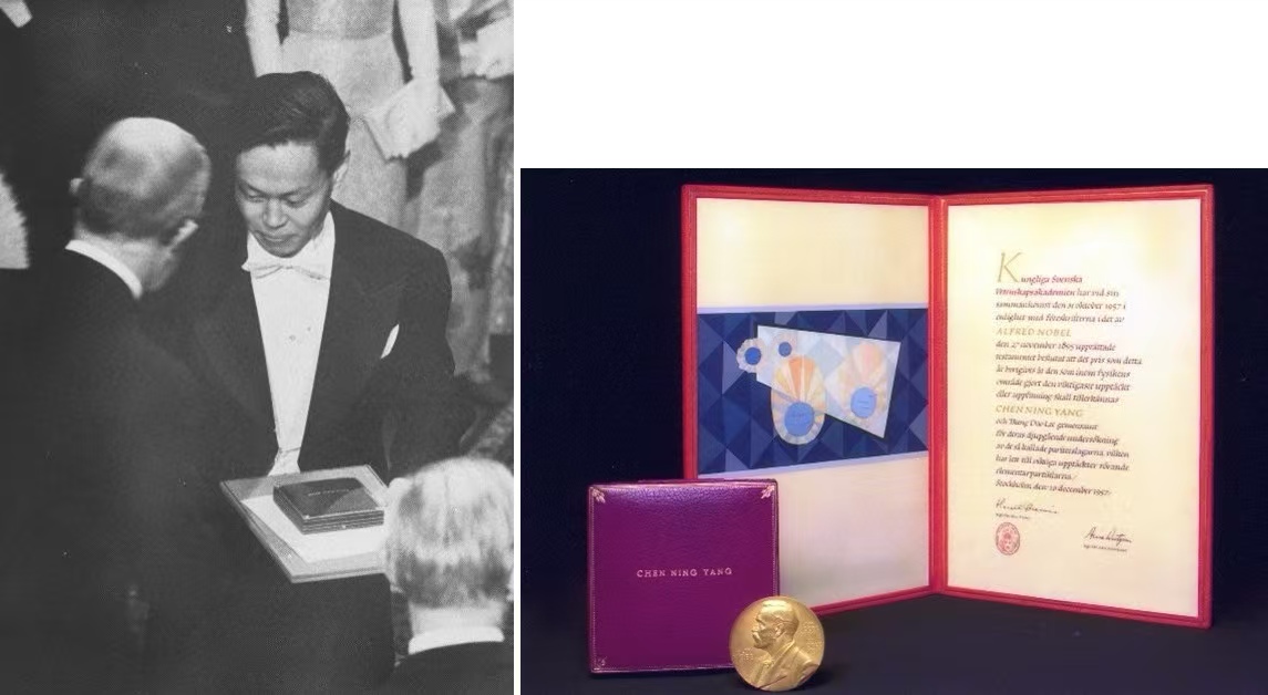 1957年楊振寧自瑞典國王手中接受諾貝爾獎章(左)、諾貝爾獎章與獎狀(右)