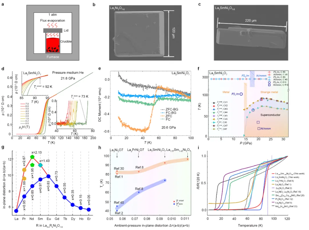 團隊發(fā)現(xiàn)La2SmNi2O7單晶在21.6GPa下Tc高達92K,零電阻溫度73K,超導體積分數(shù)超60%,明確證實該材料為體超導,同時打破了之前的鎳基超導溫度紀錄。團隊還發(fā)現(xiàn)該材料在單斜、四方兩種結(jié)構(gòu)下均能超導,為解決鎳基高溫超導機理問題提供重要結(jié)構(gòu)基礎(chǔ)。