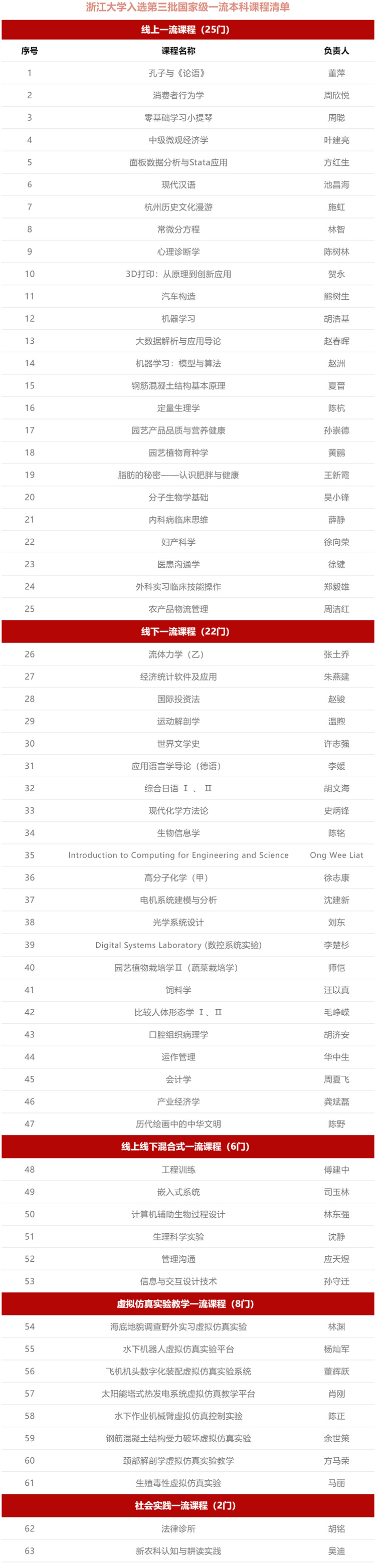 浙江大學(xué)本次共有63門課程入選,入選數(shù)量高居全國(guó)高校榜首,其中包括線上一流課程25門,線下一流課程22門,線上線下混合式一流課程6門,虛擬仿真實(shí)驗(yàn)教學(xué)一流課程8門,社會(huì)實(shí)踐一流課程2門。截止目前,浙江大學(xué)國(guó)家級(jí)一流本科課程三批共計(jì)184門課程入選,總量位列全國(guó)第三。