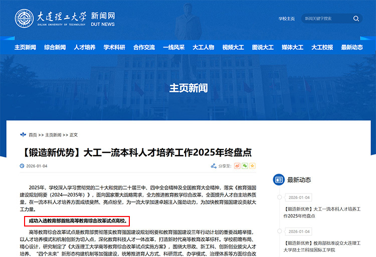 1月4日,大連理工大學(xué)發(fā)布一流本科人才培養(yǎng)工作2025年終盤點,其中提到:高等教育綜合改革試點是教育部貫徹落實教育強(qiáng)國建設(shè)規(guī)劃綱要和教育強(qiáng)國建設(shè)三年行動計劃的重要戰(zhàn)略舉措,以人才培養(yǎng)模式和機(jī)制創(chuàng)新為切入點,深化教育科技人才一體改革,打造新時代高等教育改革標(biāo)桿。學(xué)校前瞻布局、精心設(shè)計,研究制定了《大連理工大學(xué)高等教育綜合改革試點實施方案》,圍繞大思政、新工科、創(chuàng)新創(chuàng)業(yè)拔尖人才培養(yǎng)、“四個未來”新形態(tài)構(gòu)建機(jī)制等加強(qiáng)建設(shè),統(tǒng)籌推進(jìn)育人方式、科研范式、辦學(xué)模式、治理體系等方面綜合改革。學(xué)校憑借扎實的改革基礎(chǔ)、突出的改革實效和完備的改革方案,于2025年12月成為少數(shù)以“揭榜掛帥”方式成功入選教育部首批高等教育綜合改革試點的高校(全國共入選39所)。