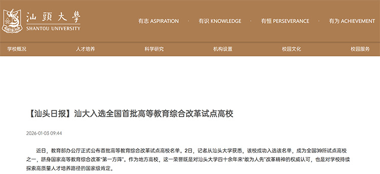 近日,教育部辦公廳正式公布首批高等教育綜合改革試點高校名單,汕頭大學(xué)憑借鮮明的辦學(xué)特色與扎實的改革基礎(chǔ),入選全國39所試點高校之一,躋身國家高等教育綜合改革“第一方陣”。