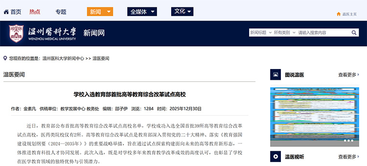 溫州醫(yī)科大學(xué)成功入選全國首批39所高等教育綜合改革試點高校,醫(yī)藥類院校僅有2所。