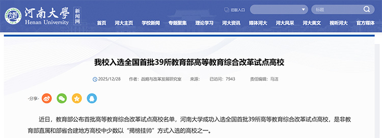 河南大學(xué)成功入選全國首批39所高等教育綜合改革試點高校,是非教育部直屬和部省合建地方高校中少數(shù)以“揭榜掛帥”方式入選的高校之一。