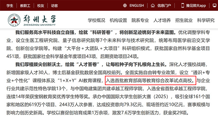 鄭州大學(xué)發(fā)布2026年新年賀詞,其中提到:全面實施自由轉(zhuǎn)專業(yè)政策,設(shè)立“通識+專業(yè)+個性化”課程體系及“1+X+Y”AI教育課程,入選首批教育部高等教育綜合改革試點高校。與企業(yè)行業(yè)共建示范性特色學(xué)院13個,與中國電建集團(tuán)共建卓越工程師學(xué)院,入選全省首批卓越工程師學(xué)院,連續(xù)14年榮獲寶鋼教育獎優(yōu)秀學(xué)生特等獎。承辦中國國際大學(xué)生創(chuàng)新大賽(2025),吸引全球161個國家和地區(qū)的619萬個項目、2443萬人次參賽,達(dá)成投資意向79.3億元、現(xiàn)場簽約近10億元,賽事規(guī)模與影響力創(chuàng)歷史新高。學(xué)校以賽促創(chuàng)培育成果1萬余項,激發(fā)7.6萬學(xué)生創(chuàng)新活力,獲金獎29項。