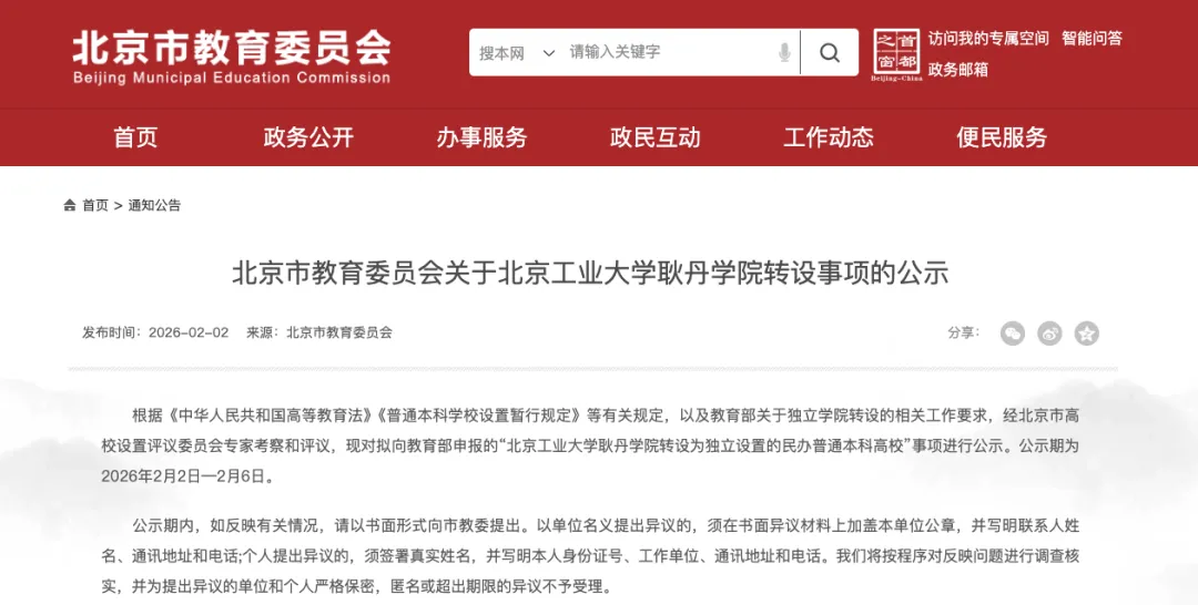 根據(jù)《中華人民共和國高等教育法》《普通本科學(xué)校設(shè)置暫行規(guī)定》等有關(guān)規(guī)定,以及教育部關(guān)于獨(dú)立學(xué)院轉(zhuǎn)設(shè)的相關(guān)工作要求,經(jīng)北京市高校設(shè)置評(píng)議委員會(huì)專家考察和評(píng)議,現(xiàn)對(duì)擬向教育部申報(bào)的“北京工業(yè)大學(xué)耿丹學(xué)院轉(zhuǎn)設(shè)為獨(dú)立設(shè)置的民辦普通本科高?!笔马?xiàng)進(jìn)行公示。公示期為2026年2月2日—2月6日。