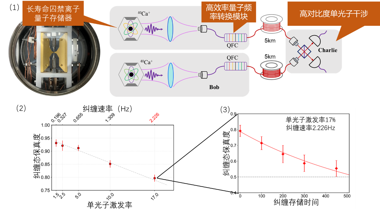 圖3. 可擴(kuò)展量子中繼的基本模塊原理圖。(1)實(shí)驗(yàn)由長(zhǎng)壽命囚禁離子量子儲(chǔ)存器、高效率量子頻率轉(zhuǎn)換模塊與高對(duì)比度單光子干涉模塊組成。(2)糾纏建立速率為2.226赫茲,即等待時(shí)間約450毫秒。(3)糾纏壽命約550毫秒。