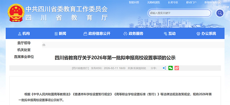 2月11日,四川省教育廳發(fā)布《關(guān)于2026年第一批擬申報(bào)高校設(shè)置事項(xiàng)的公示》。根據(jù)《中華人民共和國(guó)高等教育法》《普通本科學(xué)校設(shè)置暫行規(guī)定》《高等職業(yè)學(xué)校設(shè)置標(biāo)準(zhǔn)(暫行)》等法律法規(guī)及政策規(guī)定,現(xiàn)將2026年第一批擬申報(bào)高校設(shè)置事項(xiàng)公示。其中,以川北醫(yī)學(xué)院為基礎(chǔ),擬設(shè)置川北醫(yī)科大學(xué)。