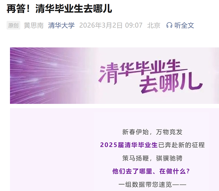 近日,清華大學(xué)官微公布2025屆畢業(yè)生就業(yè)數(shù)據(jù)。