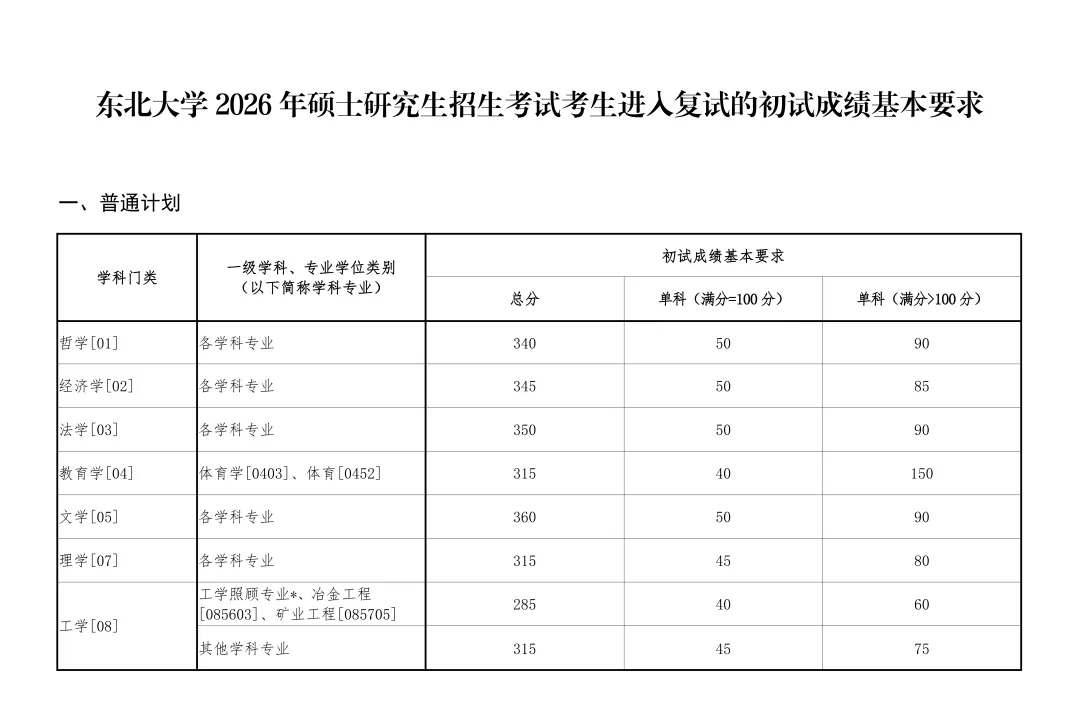 東北大學2026年碩士研究生招生考試考生進入復試的初試成績基本要求