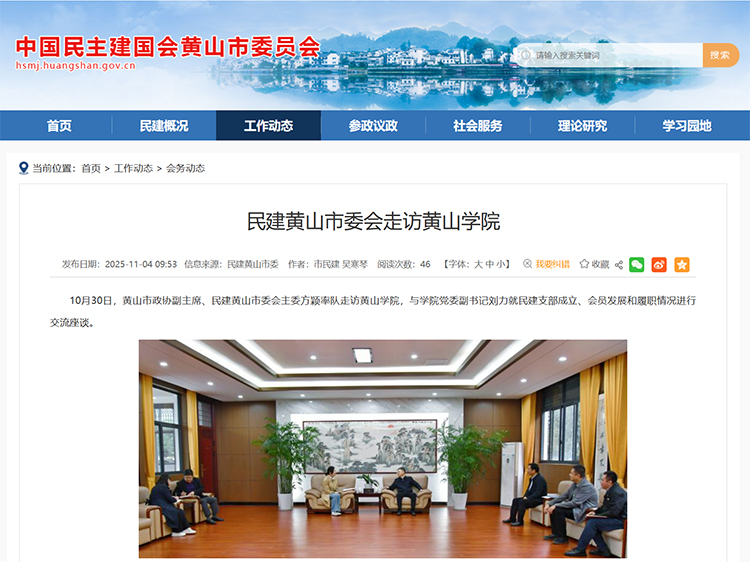 中國民主建國會黃山市委員會官網(wǎng)消息,近日,黃山市政協(xié)副主席、民建黃山市委會主委方穎率隊走訪黃山學(xué)院,與學(xué)院黨委副書記劉力就民建支部成立、會員發(fā)展和履職情況進行交流座談。
