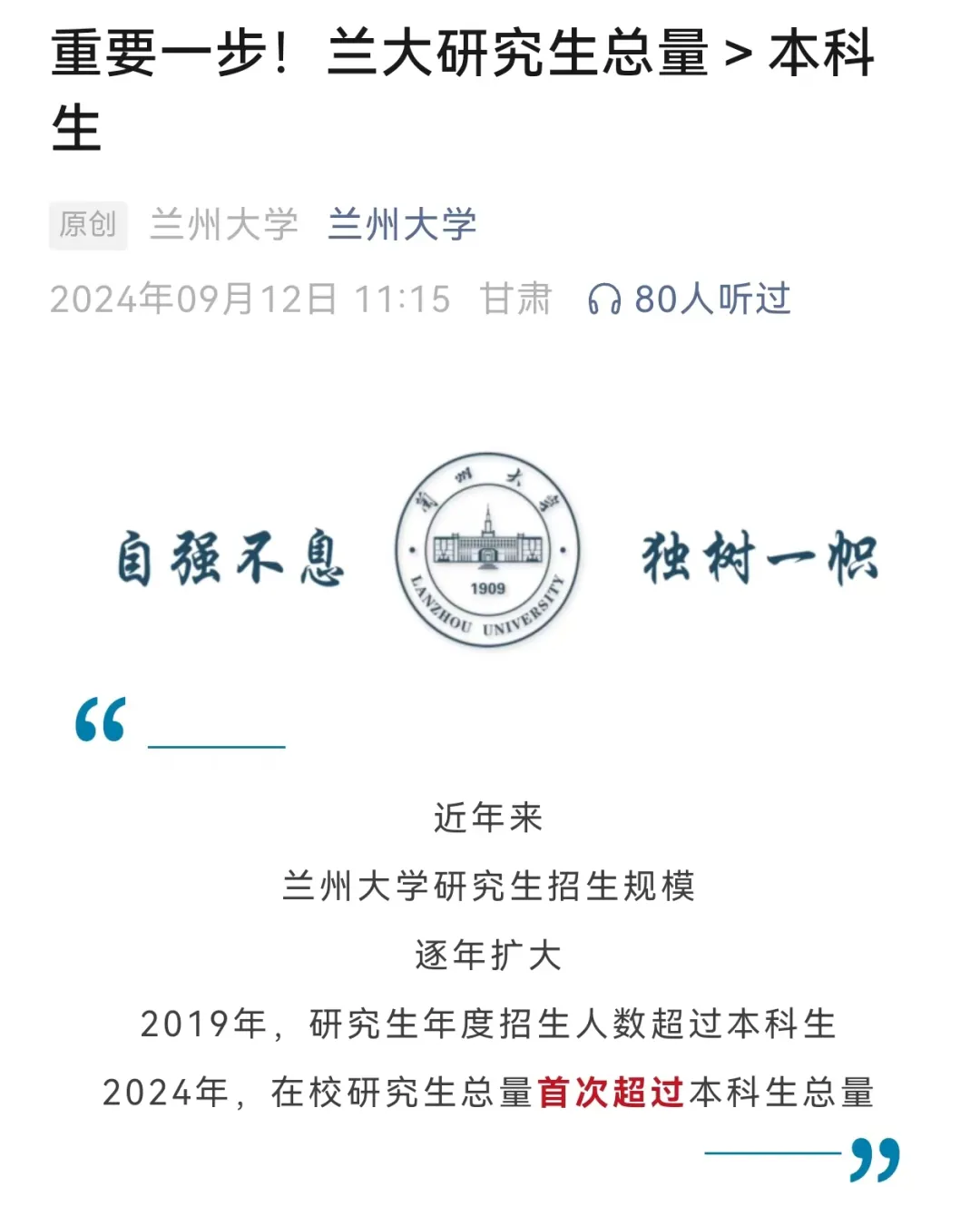 日前,蘭州大學(xué)宣布,2024年,在校研究生總量首次超過(guò)本科生總量。據(jù)介紹,近年來(lái),蘭州大學(xué)研究生招生規(guī)模逐年擴(kuò)大,其中在2019年研究生年度招生人數(shù)已超過(guò)本科生。