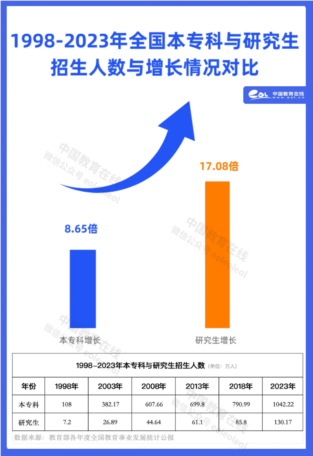 如果對(duì)比1998年“大擴(kuò)招”元年——本專(zhuān)科招生增長(zhǎng)近9倍,而研究生的增長(zhǎng)則超過(guò)17倍!相比之下,研究生的增長(zhǎng)比例是遠(yuǎn)遠(yuǎn)高于本專(zhuān)科的。
