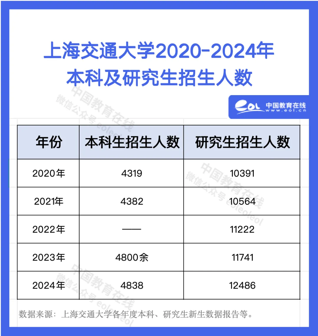 上海交通大學(xué)自2020年至今,本科生招生人數(shù)均在4000多人,而研究生招生則一直在萬(wàn)人以上,2024年達(dá)12486人。近五年來(lái),其研究生招生數(shù)一直在本科招生數(shù)的兩倍以上。