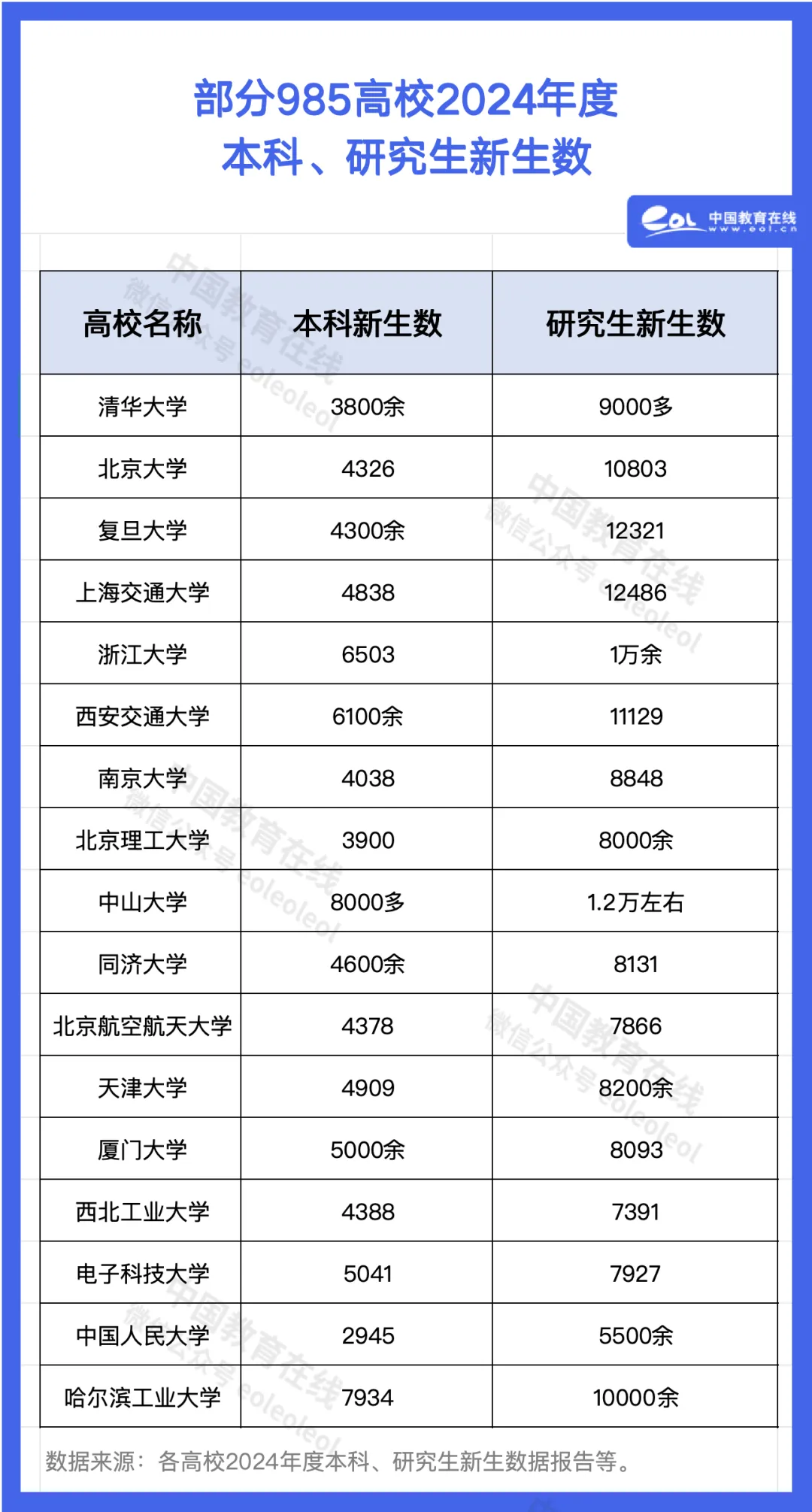 從2024年招生數(shù)據(jù)來(lái)看,絕大多數(shù)985高校的研究生招生人數(shù)均超過(guò)本科生,其中“清北復(fù)交”等頭部高校,研究生招生人數(shù)均為本科生的兩倍以上,多所985研究生新生規(guī)模已破萬(wàn)。