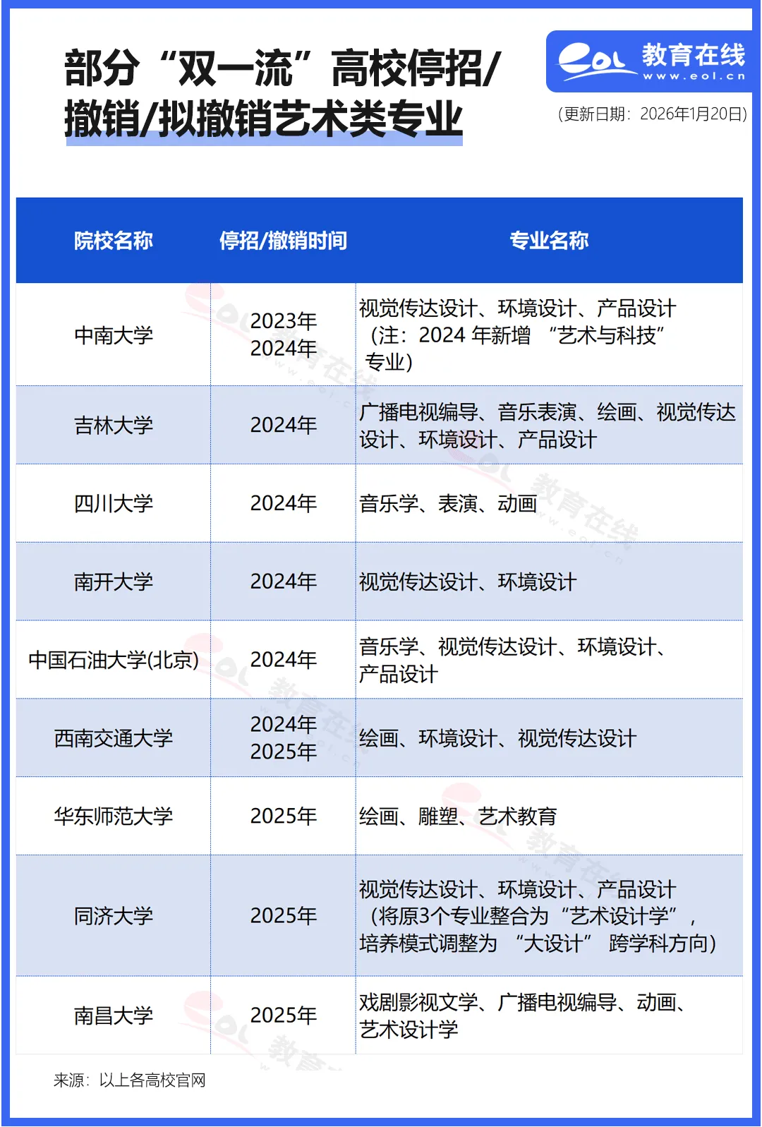 近日,吉林大學本科生院更新的本科專業(yè)目錄引發(fā)關注:該校141個本科專業(yè)中19個已停招,其中6個為藝術學類專業(yè)——廣播電視編導、音樂表演、作曲與作曲技術理論、產品設計、環(huán)境設計、視覺傳達設計,且均在2024年停招。
