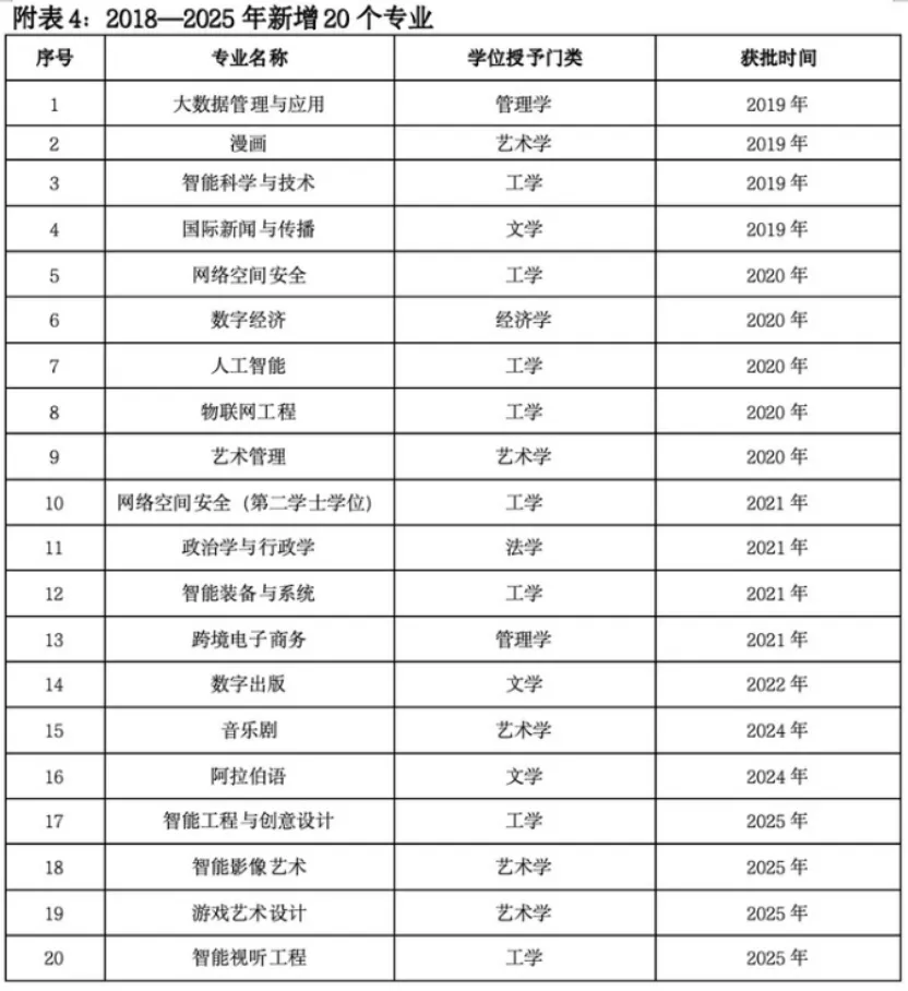 中國傳媒大學(xué)2018年至2025年新增專業(yè)名單
