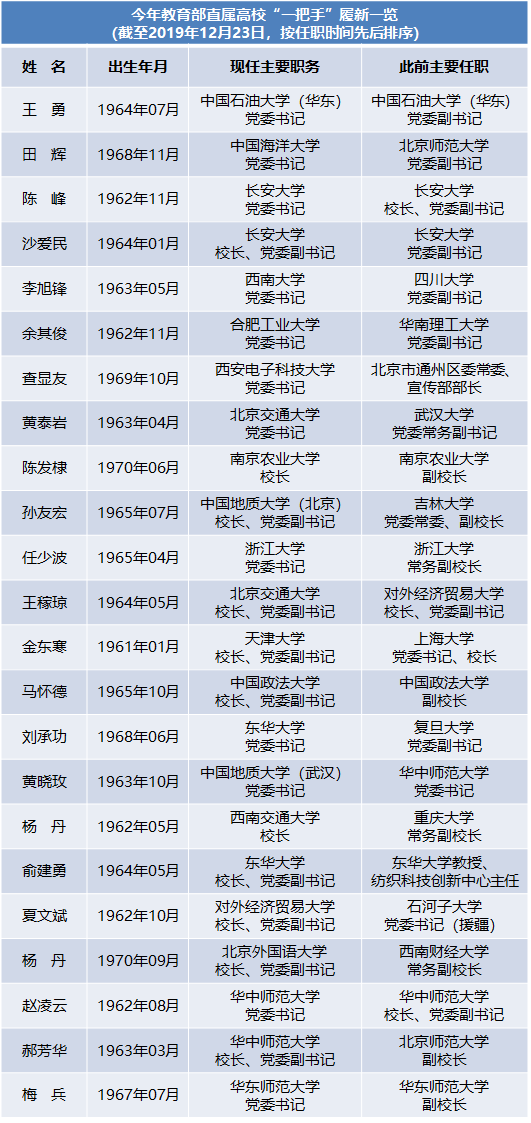記者梳理教育部網(wǎng)站信息發(fā)現(xiàn),2019年至今已有至少19所教育部直屬高?!耙话咽帧闭{(diào)整,12位黨委書記、11位校長(zhǎng)走上了新的工作崗位。其中,長(zhǎng)安大學(xué)、北京交通大學(xué)、東華大學(xué)和華中師范大學(xué)四所高校的黨委書記、校長(zhǎng)今年雙雙調(diào)整。(具體情況見下表)