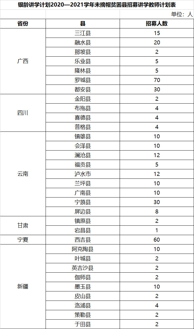 以縣為基本單位,主要是國家確定的連片特困地區(qū)縣、國家扶貧開發(fā)工作重點縣、省級扶貧開發(fā)工作重點縣、深度貧困縣,貧困的民族縣、革命老區(qū)縣、邊境縣以及新疆生產(chǎn)建設(shè)兵團困難團場等,重點向“三區(qū)三州”等深度貧困地區(qū)、特別是未摘帽貧困縣傾斜。受援學(xué)校為縣鎮(zhèn)和農(nóng)村學(xué)校。