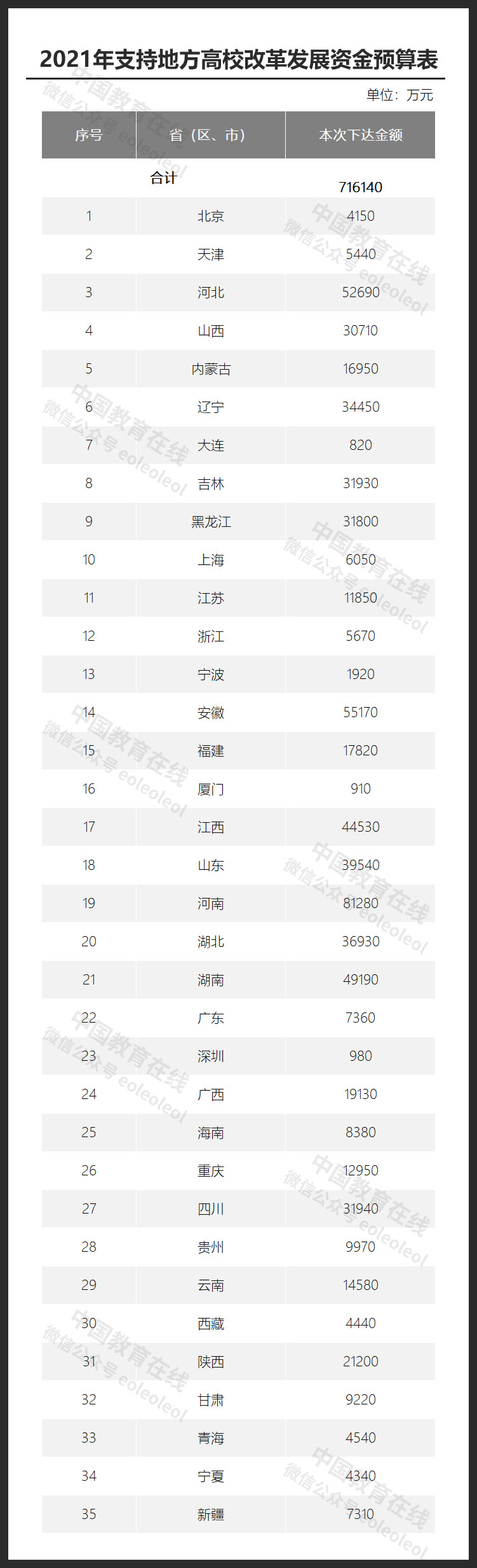 從《2021年支持地方高校改革發(fā)展資金預(yù)算表》來看,河南省最高,為81280萬元。其次是安徽省(55170萬元)、河北?。?2690萬元)、湖南省(49190萬元)、江西?。?4530萬元)均超過4億元。