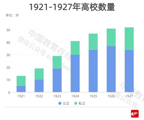 1921年,我國大學(xué)僅有13所,其中公立大學(xué)僅有5所。自1922年始公私立大學(xué)總數(shù)迅速增加至19所,公立大學(xué)數(shù)量升至10所。1923年大學(xué)總數(shù)29所,1926年51所,在1921-1926年期間公私立大學(xué)數(shù)由13所增加到了51所,增加了3倍;學(xué)生在校生和畢業(yè)生人數(shù)也有所增加。
