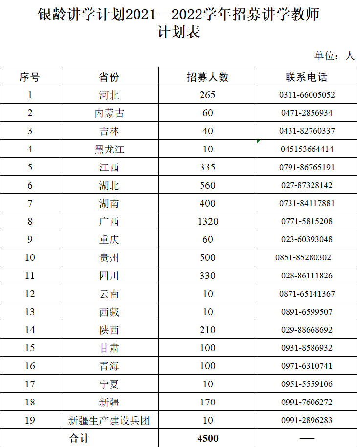 2021年計(jì)劃招募4500名講學(xué)教師。申請(qǐng)銀齡講學(xué)計(jì)劃的退休教師以校長(zhǎng)、教研員、特級(jí)教師、骨干教師為主。年齡一般在65(含)歲以下。講學(xué)教師原則上應(yīng)具有中級(jí)及以上教師職稱,以高級(jí)教師為主。原單位返聘退休教師工作不列入銀齡講學(xué)計(jì)劃。